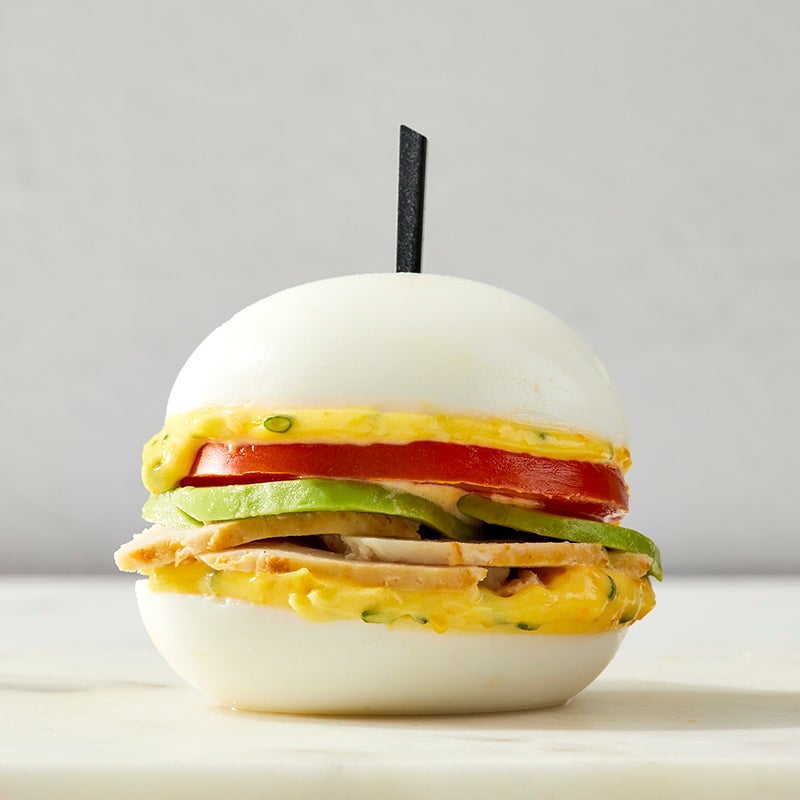 To assemble “sandwiches,” top each of 4 egg halves with ½ oz turkey and 2 slices avocado and 1 slice tomato. Top each “sandwich” with a remaining egg half; secure with a toothpick and serve.